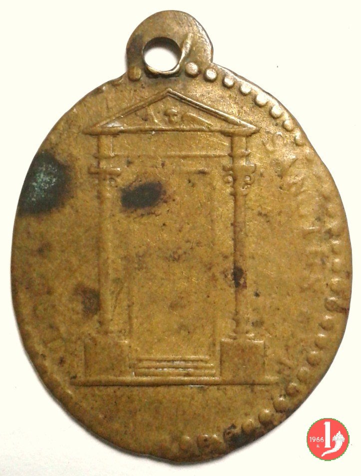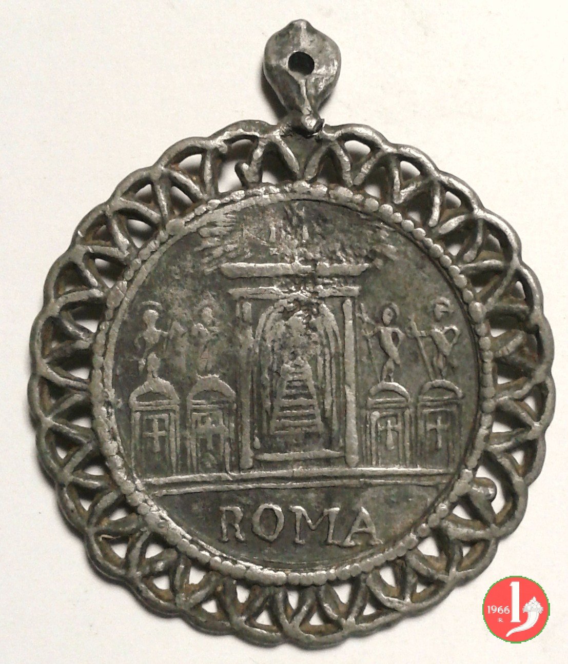 Verso: La Scala Santa affiancata dalle porte delle quattro Basiliche con statue alla sommità, in alto il S. Sudario radiato sorretto da due angeli
