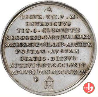 Verso: nel campo: * = LEONE • XII • P • M • = BENEDICTVS = TIT • S • CLEMENTIS = S • R • E • PRESB • CARDINAL • NARO = SACROS • BASIL • LIB • ARCHIP • = PORTAM • AVREAM = STATIS • DIEBVS = APERVIT • ET • OCCLVSIT = AN • IVBILAEI • MDCCCXXV