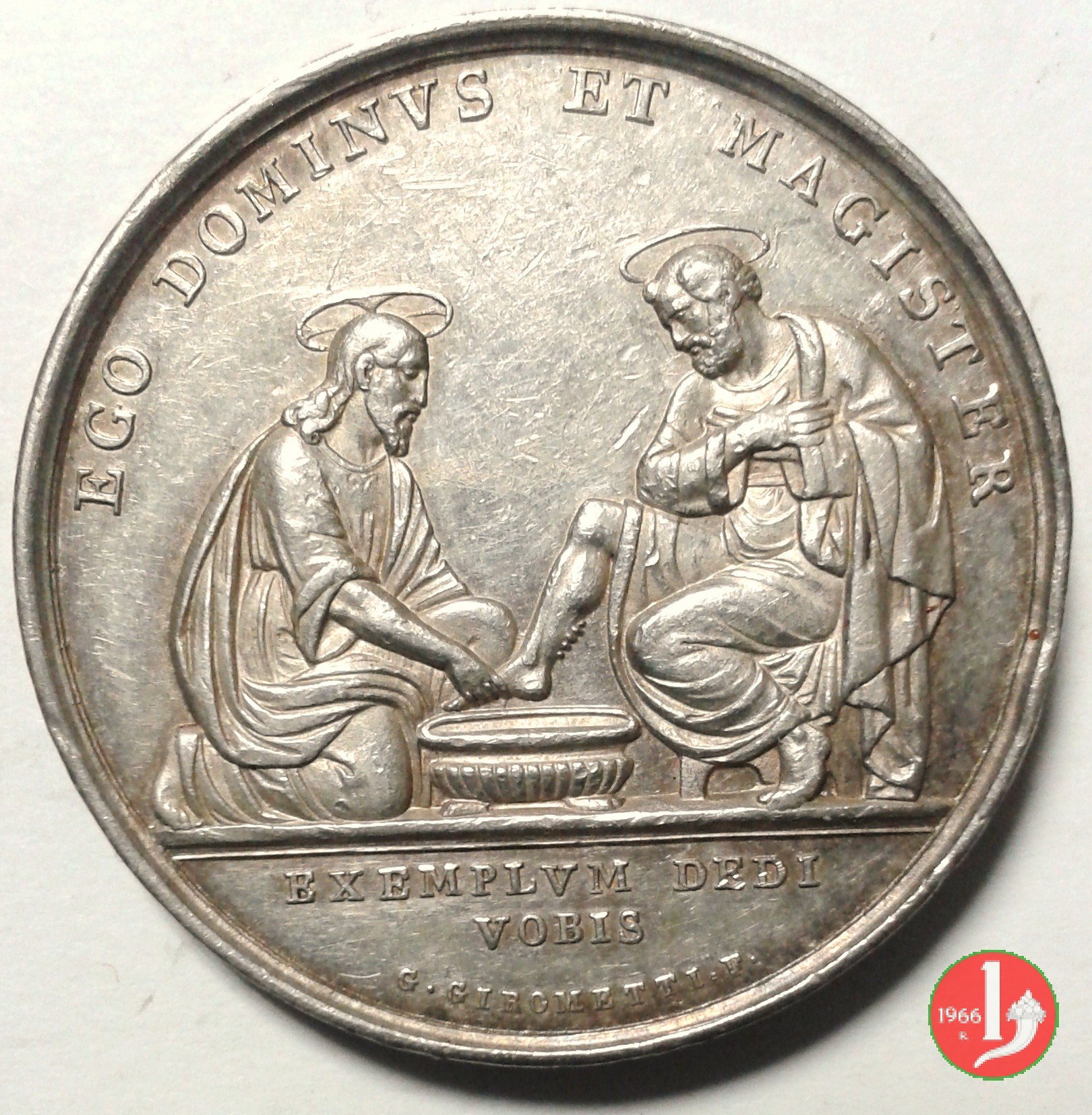 Lavanda dei piedi - A . XVI -Bo205 Obverse: GREGORIVS • XVI • _ PONT • MAX • A • XVI busto con mozzetta e stola a dx sotto: G • CERBARA • F • Gesú genuflesso a dx lava i piedi a S. Pietro seduto a sx in esergo: EXEMPLVM DEDI = VOBIS = G • Girometti • F • |