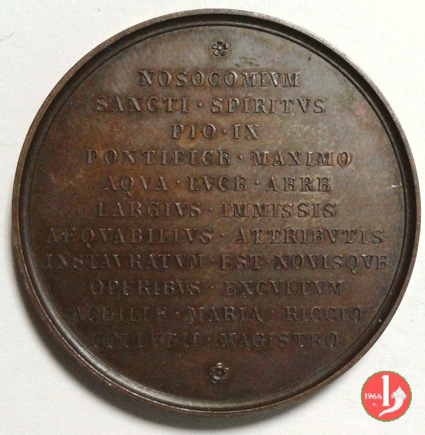 Verso: NOSOCOMIVM = SANCTI • SPIRITVS = PIO • IX = PONTEFICE • MAXIMO = AQVA • LUCE • AERE = LARGIVS INMISSIS = AEQVABILIVS • ATTRIBVTIS = INSTAVRATVM • EST • NIVISQVE = OPERIBVS • EXCVLTVM = ACHILLE • MARIA • RICCIO = COLLEGII • MAGISTRO