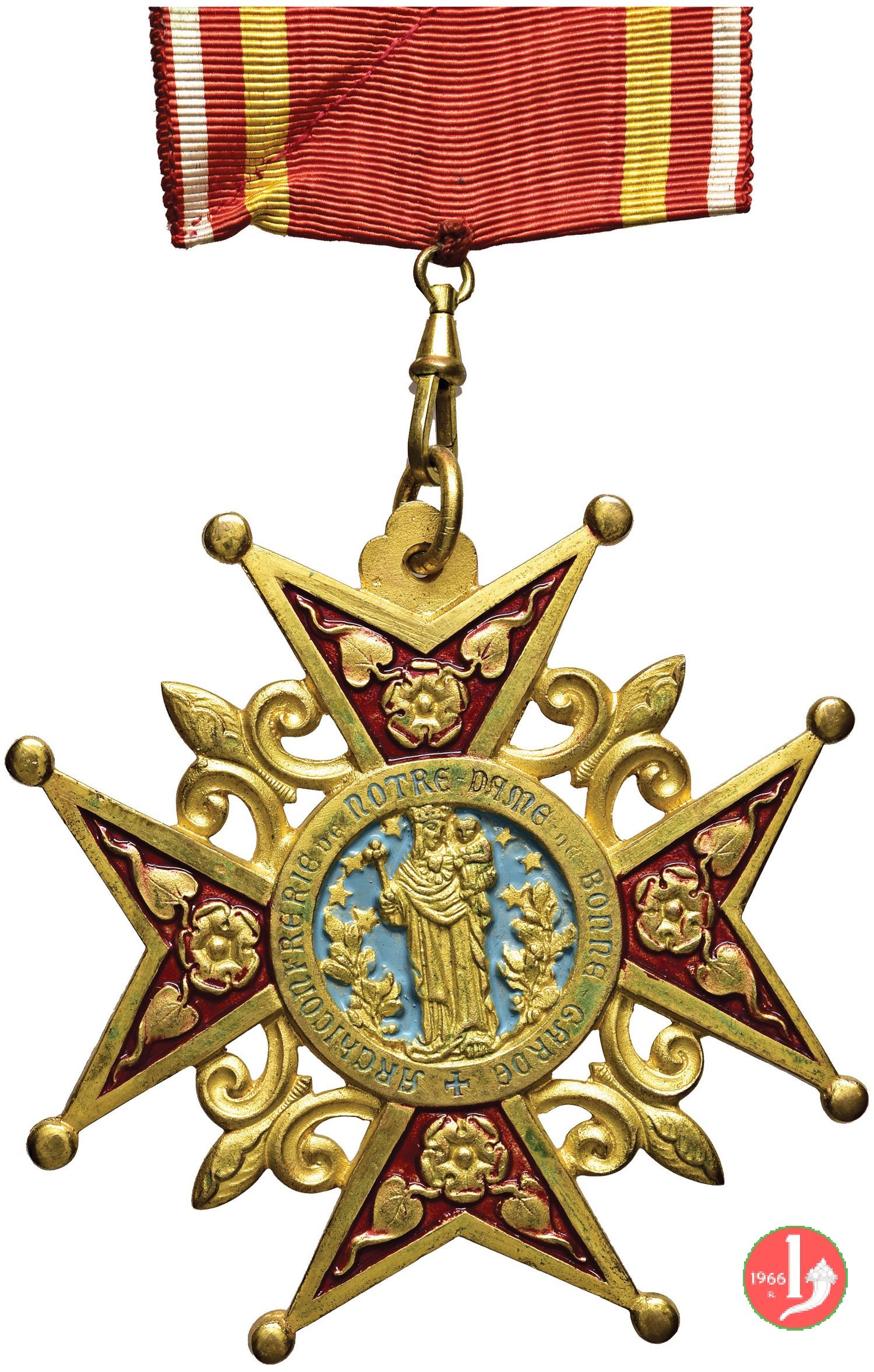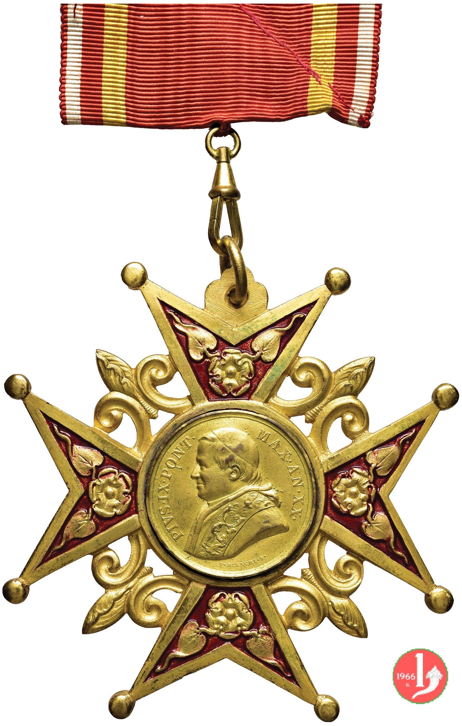 Dritto: al centro di Croce dorata contenete sui bracci rose e foglie dorate entro smalti rossi: