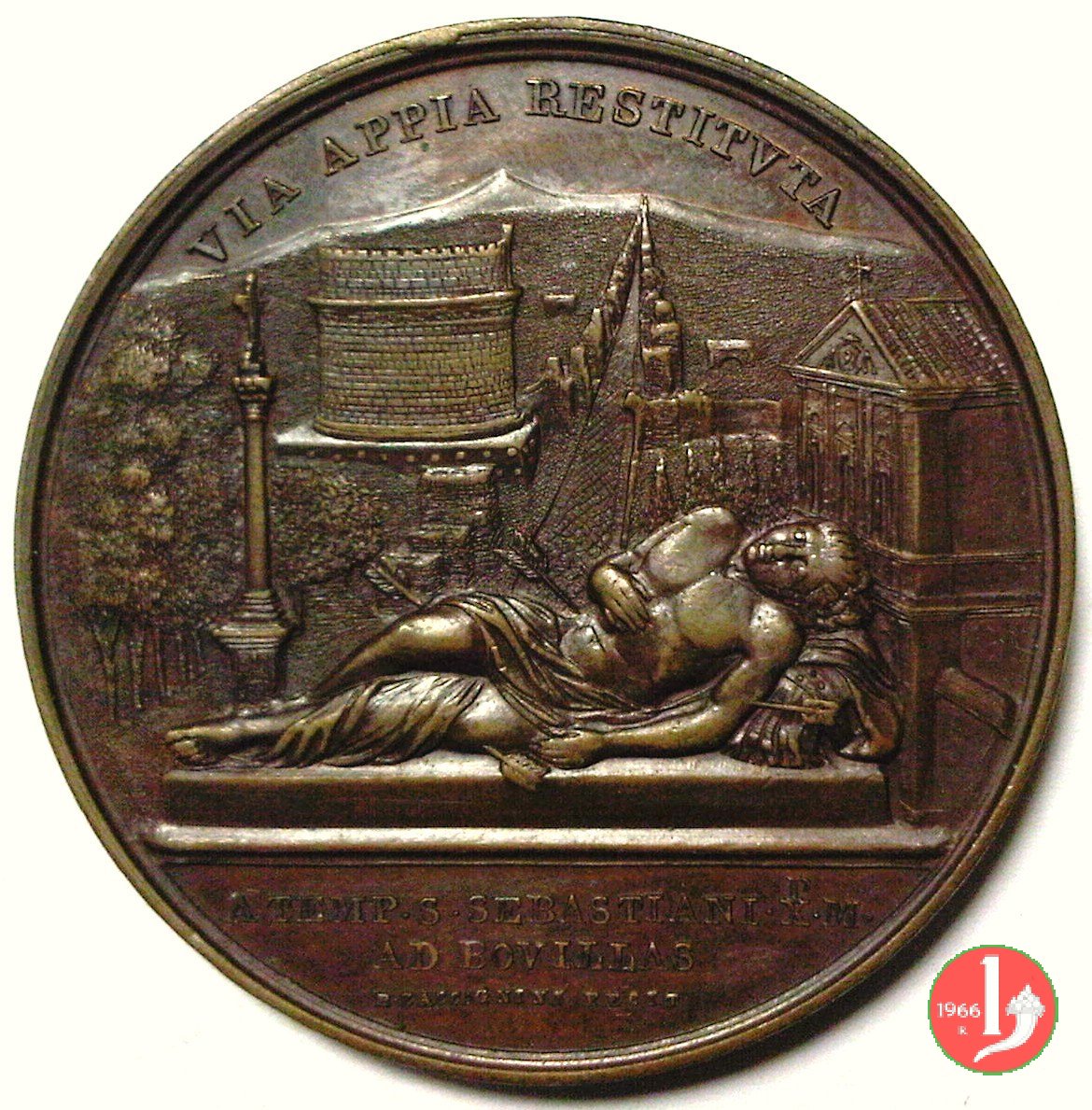 A. VII -Sistemazioni sulla Via Appia -B1 Dritto: PIVS IX • PONTIFEX _ MAXIMVS ANNO VII • busto con mozzetta e stola a dx sotto: BONFIL • ZACCAGNINI INC • S. Sebastinano su tomba coricato verso dx, dietro lui la Via Appia con a dx la chiesa di S. Sebastiano e a sx la tomba di Cecilia Metella in esergo: A TEMP • S • SEBASTIANI • X • M • = AD BOVILLAS = B • ZACCAGNINI FECIT | |