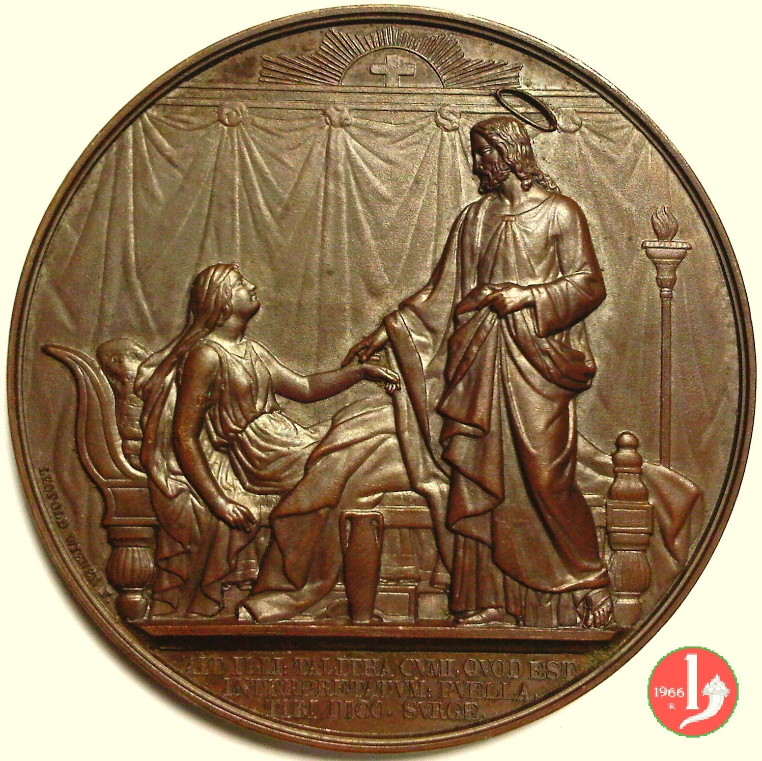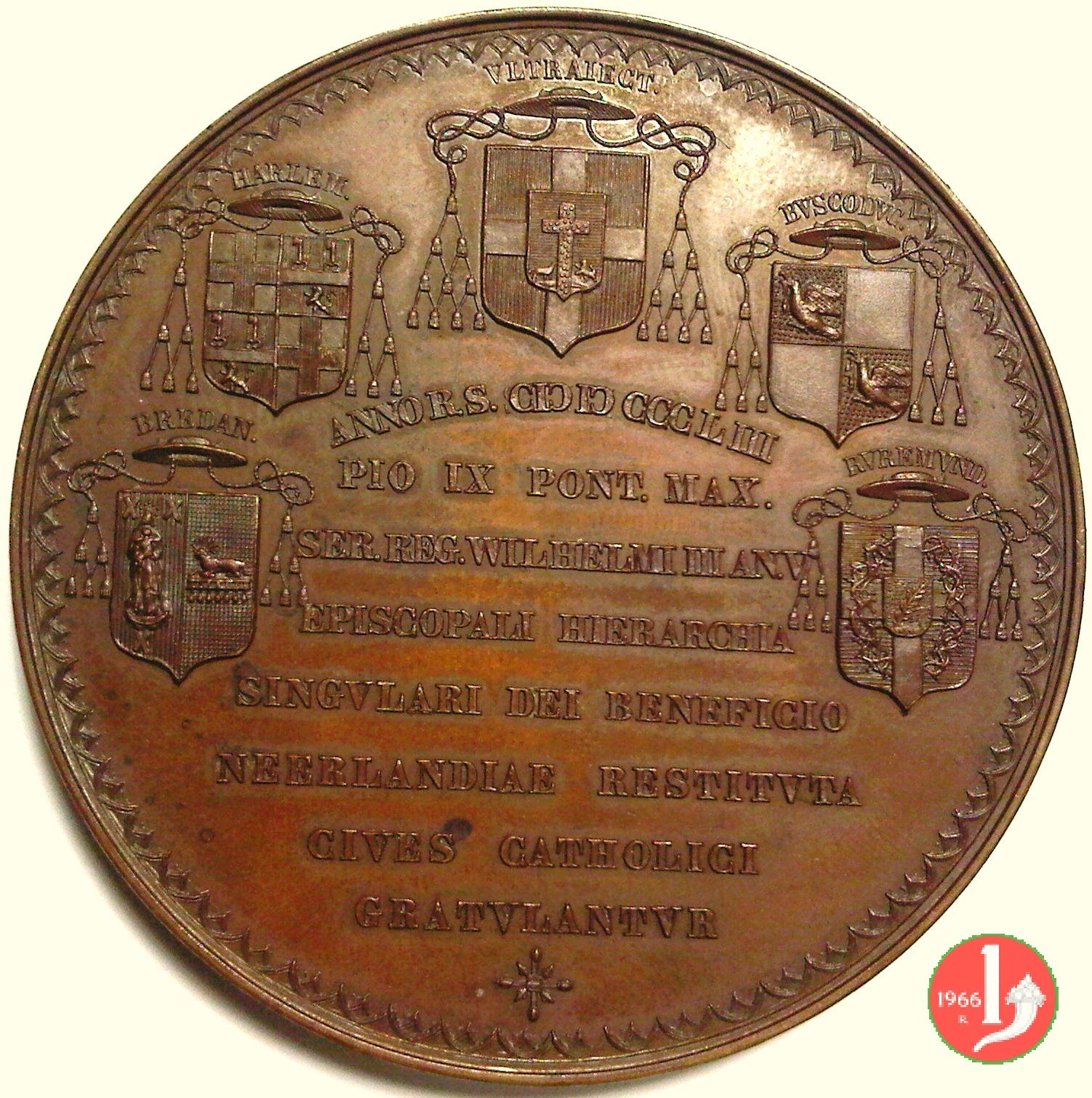 Gerachia Episcopale in Olanda -B12 Dritto: La resurrezione della figlia di Giairo: a dx Gesú in piedi nimbato, prende la mano alla fanciulla velata e assisa su dormeuse, sullo sfondo tendaggio sormontato da Croce entro calotta raggiante, a dx torcia ardente (emblema del cero pasquale e della resurrezione) in esergo: AIT ILLI in basso presso il bordo sx: LEOPOLD WIENER F • nel campo: ANNO R • S • CICICCCCLIII = PIO IX PONT MAX = SER • REG • WILHELMI III AN • V = EPISCOPALI HIERARCHIA = SINGVLARI DEI BENEFICIO = NEERLANDIAE RESTITVTA = CIVES CATHOLICI = GRATVLANTVR = * | |