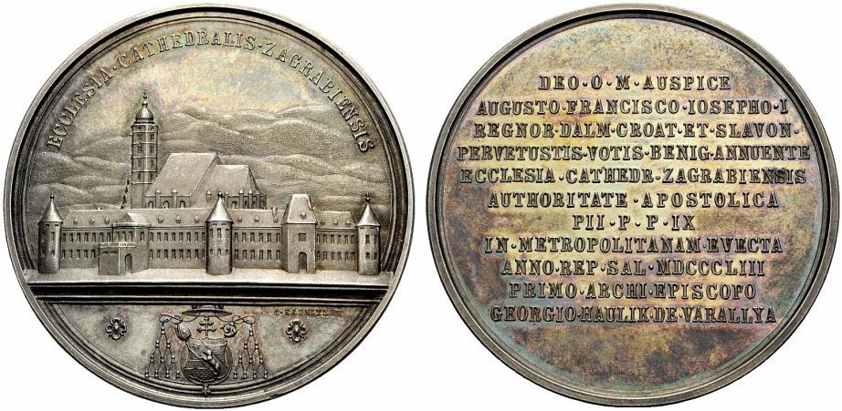 Ripristino Arcivescovato di Zagabria -B17 Dritto: ECCLESIA • CATHEDRALIS • ZAGRABIENSIS Vista della Cattedrale con cinta muraria in esergo: * stemma vescovile con galero a dieci nodi * a lato sopra: C. RADNITZKY | |
