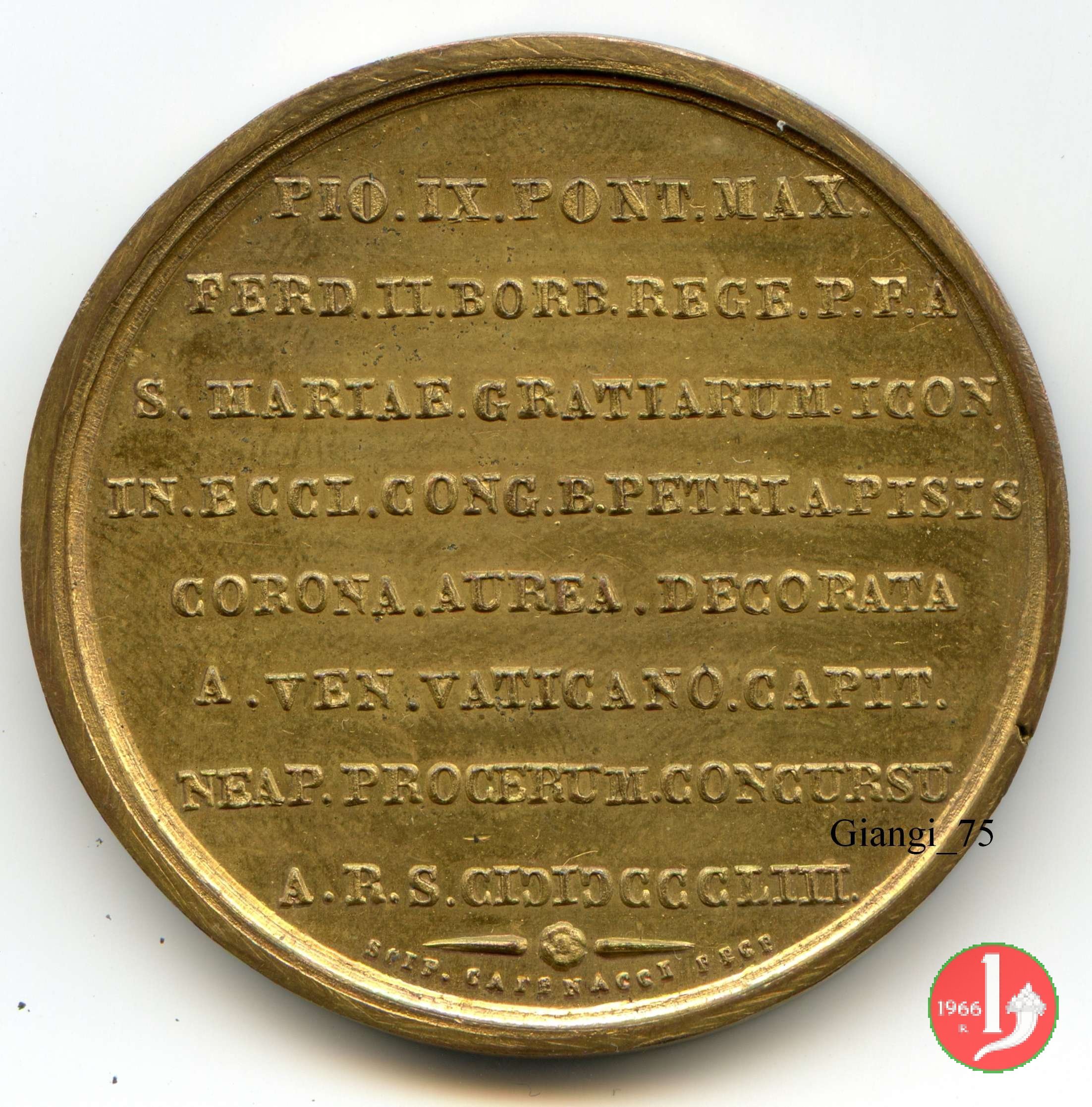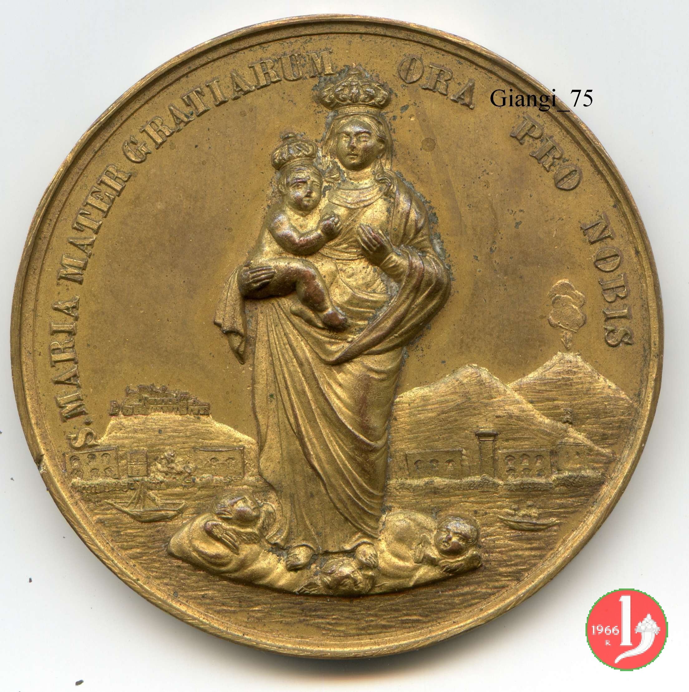 Incoronazione B.V. delle Grazie a Napoli -B16 Dritto: S. MARIA MATER GRATIARUM ORA PRO NOBIS La B.V. in piedi, di fronte, con il bambino su nubi, sullo sfondo Napoli e il Vesuvio S • MARIA GRATIARUM PIO IX AC FERD • II FAVENTIBUS CORONA AUREA DONATA = MDCCCLIII in esergo: monogramma di Maria Vergine | |