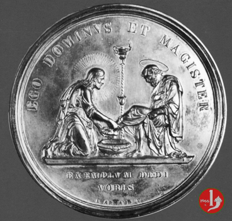 lavanda dei piedi MMax- A . VII -B14 Dritto: PIO IX PONT. MAXIMO PRINCIPE OTTIMO busto a sx con berretto, mozzetta d'ermellino e stola sotto: LUIGI ARNAUD SCOLPI' DAL VERO NEL 1849 sotto: 1853 Gesú a sx lava i piedi a San Pietro in esergo: EXEMPLVM = DEDI = VOBIS in basso: L. ARNAUD F. | |