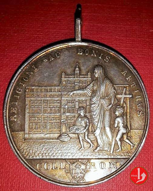 Premio Alunni Collegio Romano-B8 Dritto: PIVS • IX • PONTIFEX • MAXIMVS • ANNO • VII • (VII è in incuso) Busto a dx con berretto, mozzetta e stola sotto: G • CERBARA F • La Religione in piedi fra due putti, sullo sfondo il collegio romano in esergo: Stemma della compagnia del Gesú ai lati: COLL • _ ROM • | |