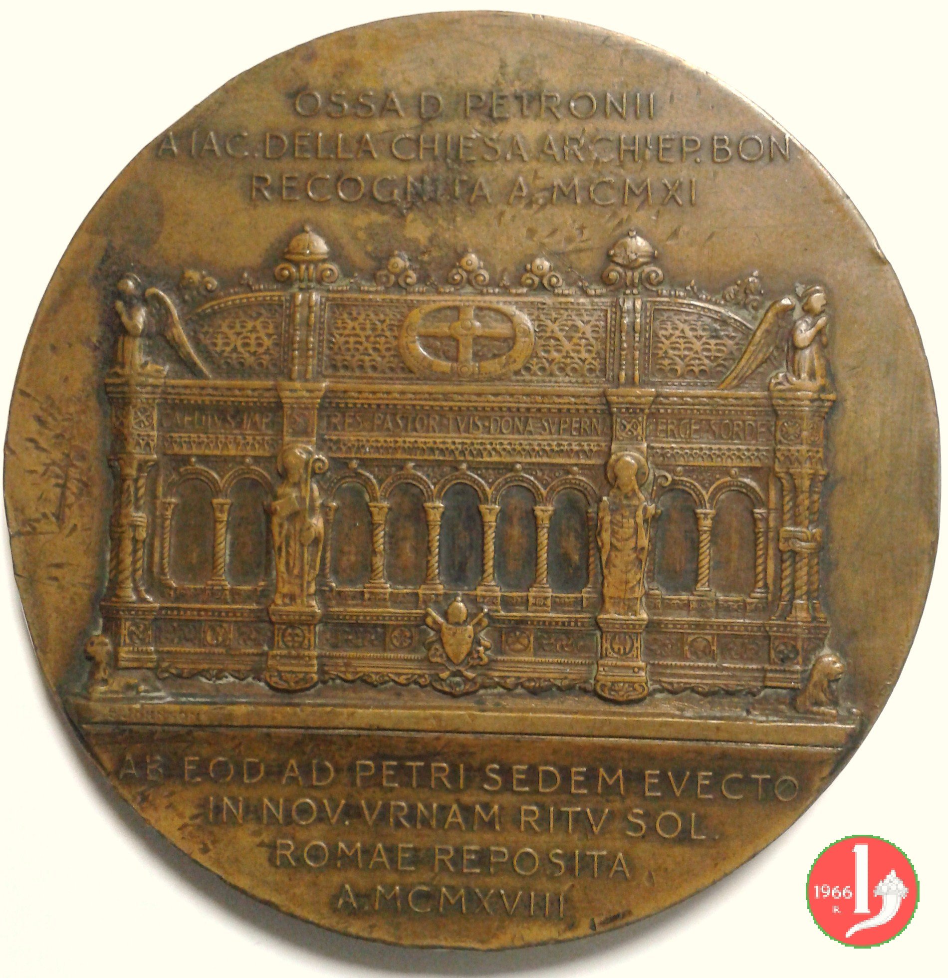 Verso: OSSA D. PETRONI A IAC. DELLA CHIESA ARCHIEP. BON RECOGNITA A • MCMXI
