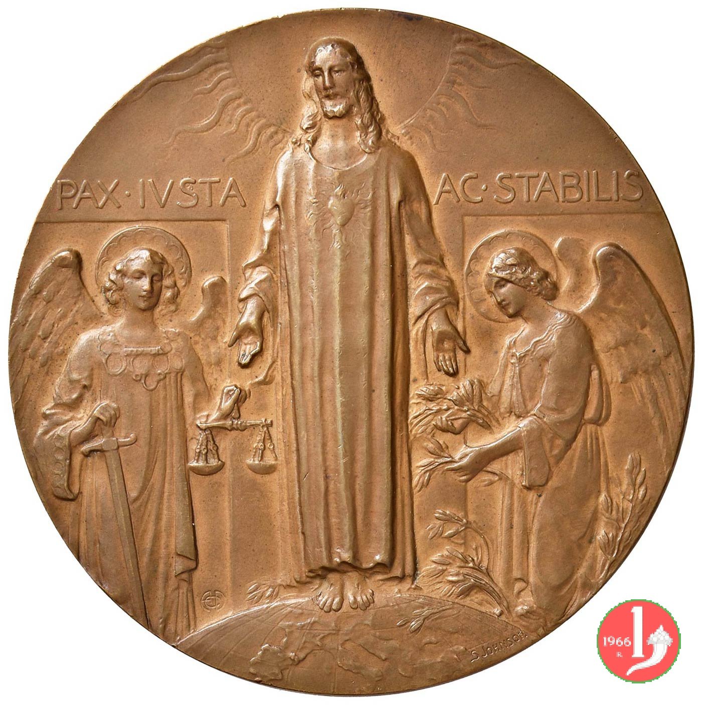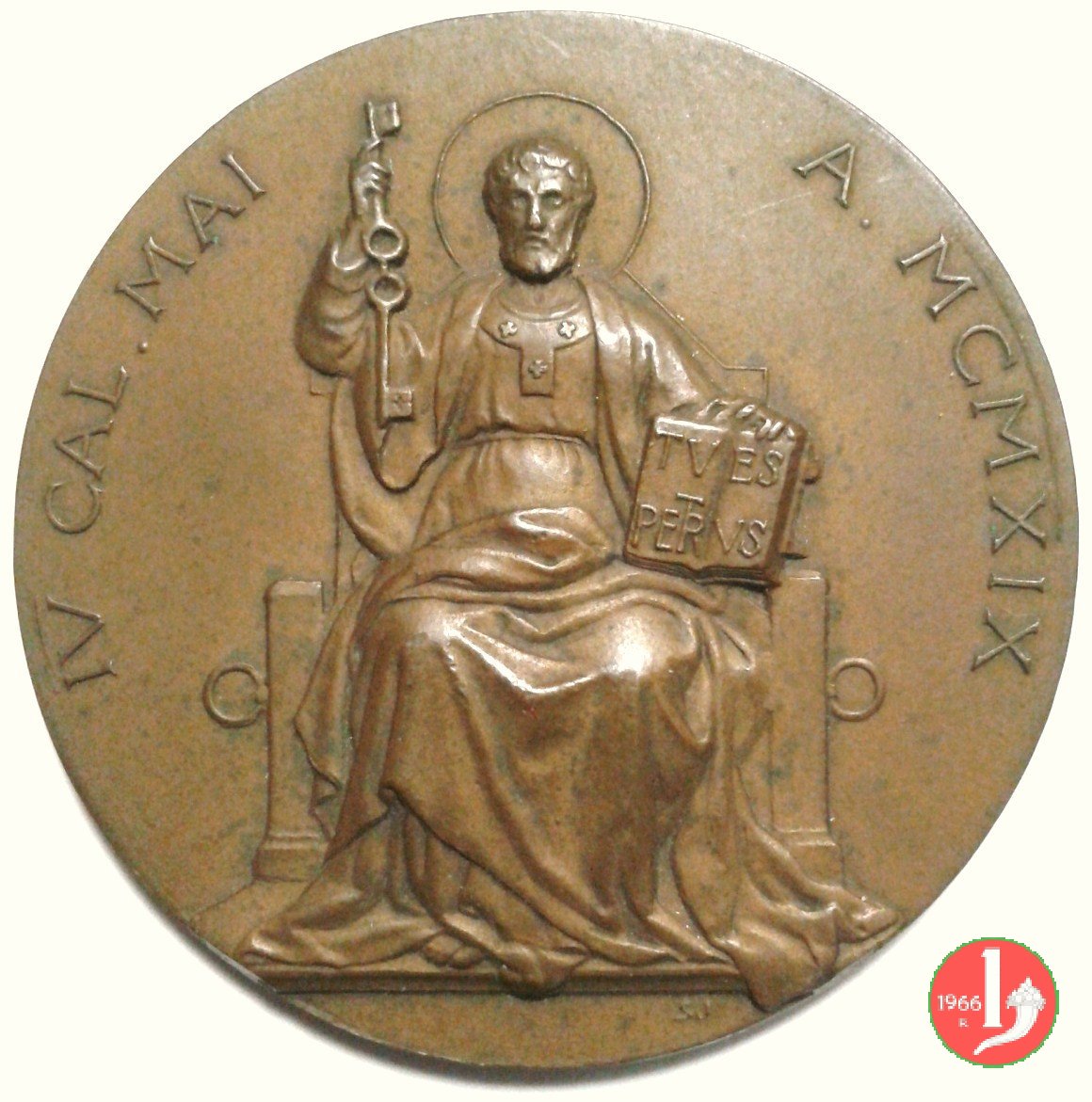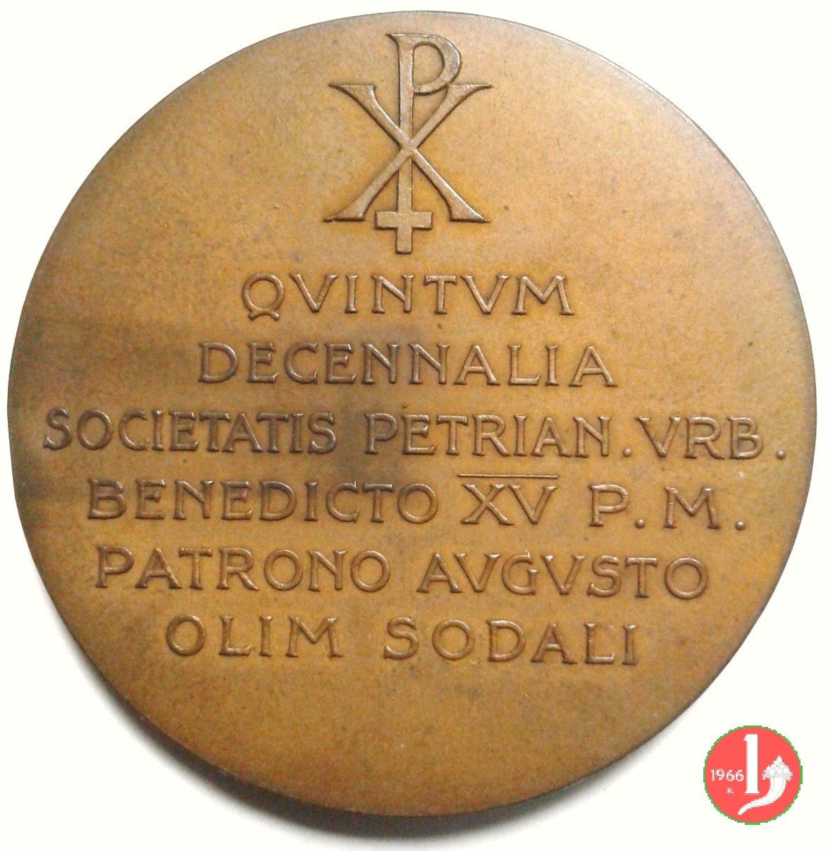 Verso: nel campo: PX = QVINTVM = DECENNALIA = SOCIETATIS PETRIAN. VRB. = BENEDICTO XV P. M. = PATRONO AVGVSTO = OLIM SODALI