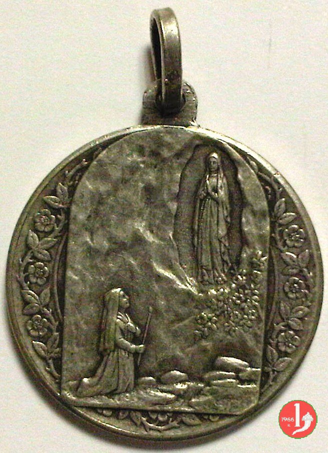 in riquadro arcato, entro cornice di rose: L'apparizione della B.V. nella grotta