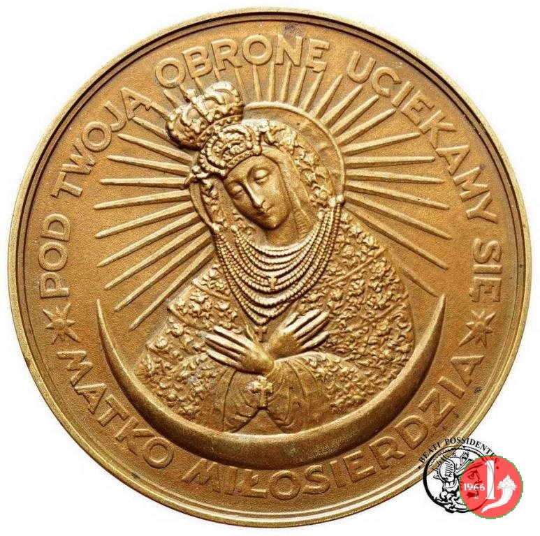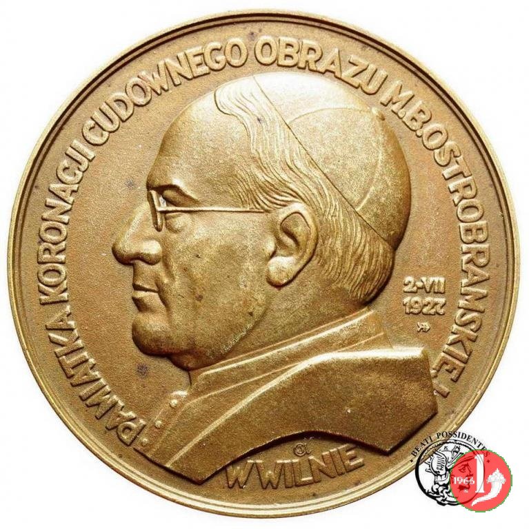 Madonna di Ostra Brama -CM148 Obverse: PRAMIATKA CORONACJI CUDOWNEGO OBRAZU M. B. OSTROBRAMSKIEJ _ busto a sx con berretto e mozzetta nel campo, a sx: 2 - VII = 1927 sotto, monogramma: AJ in basso: W WILNIE La Madonna a capo nimbato e raggiante a braccia conserte su crescente lunare | |