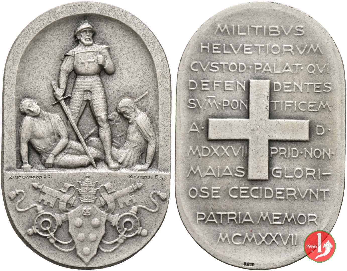 400° Resistenza Guardia Svizzera al Sacco di Roma-CM145 Obverse: Una guardia Svizzera in piedi di fronte tra due soldati caduti ai lati sotto la linea esergo: ZIMMERMANN SC. _ HUGUENIN FEC. in esergo: stemma Papale coronato da triregno e chiavi decussate | |