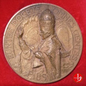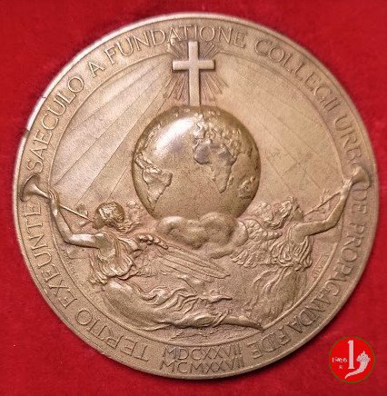 300° Collegio Urbano di Propaganda Fide -CM146 Obverse: EUNTES DOCETE _ OMNES GENTES = PIUS XI busto benedicente a sx con triregno e piviale sulla sedia gestatoria a sx: SILVA S. sotto: MDCXXVII = MCMXXVII Croce raggiante su globo, sotto due angeli con trombe in basso a sx: F. M. LORIOLI in basso a dx: SILVA S. | |
