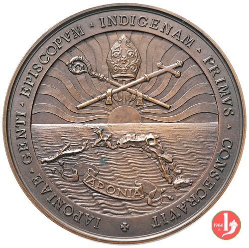 Primo Vescovo Giapponese -CM149 Obverse: PIVS • XI • PONT • MAX • • D • XXX • OCT • MCMXXVII busto a dx con berretto, mozzetta d'ermellino e stola sotto: MISTRVZZI mitra su pastorale e croce decussati, sotto la il Giappone e all'orizzonte il sole nascente, sotto, nel mare su nastro: JAPONIA | |