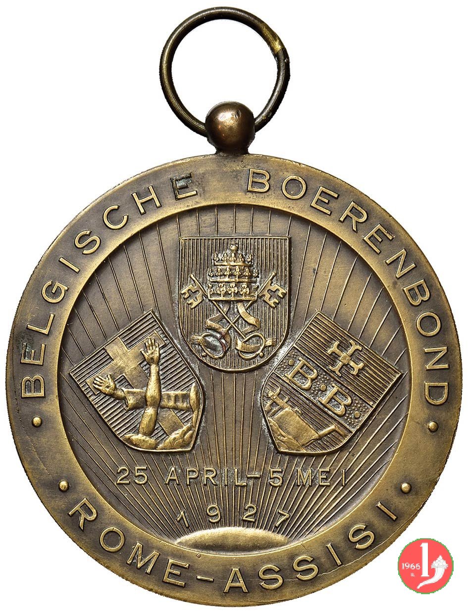 Pellegrinaggio Belga a Roma ed Assisi Obverse: PIVS XI. _ PONT. MAX. busto a sx con berretto, mozzetta d'ermellino e stola con Stemma Papale sul taglio spalla: ANT. JONFEN Stemma Papale tra i due Stemmi di associazioni cattoliche Belga, irraggiati da sole nascente in basso sotto: 25 APRIL-5MAI = 1927 | |