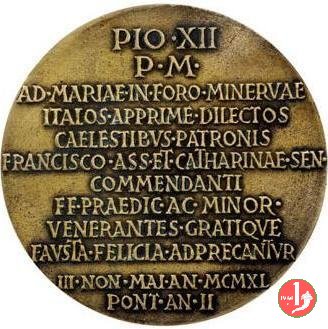 Verso: PIO • XII = P • M • = AD • MARIAEA • IN • FORO • MINERVAE = ITALOS • APPRIME • DILECTOS = CAELESTIBVS • PATRONIS = FRANCISCO • ASS • ET • CATHARINAE • SEN • = COMMENDATI = FF • PRAEDIC • AC • MINOR • = VENERANTES • GRATIQVE = FAVSTA • FELICIA • ADPRECANTVR = III • NON • MAI • AN • MCMXL = PONT • AN • II