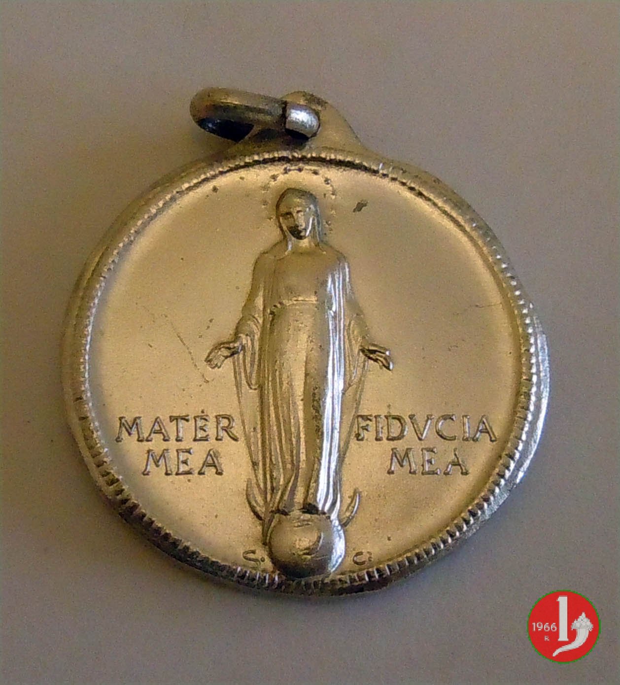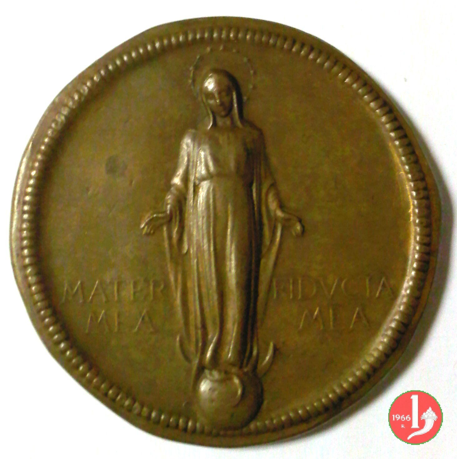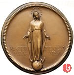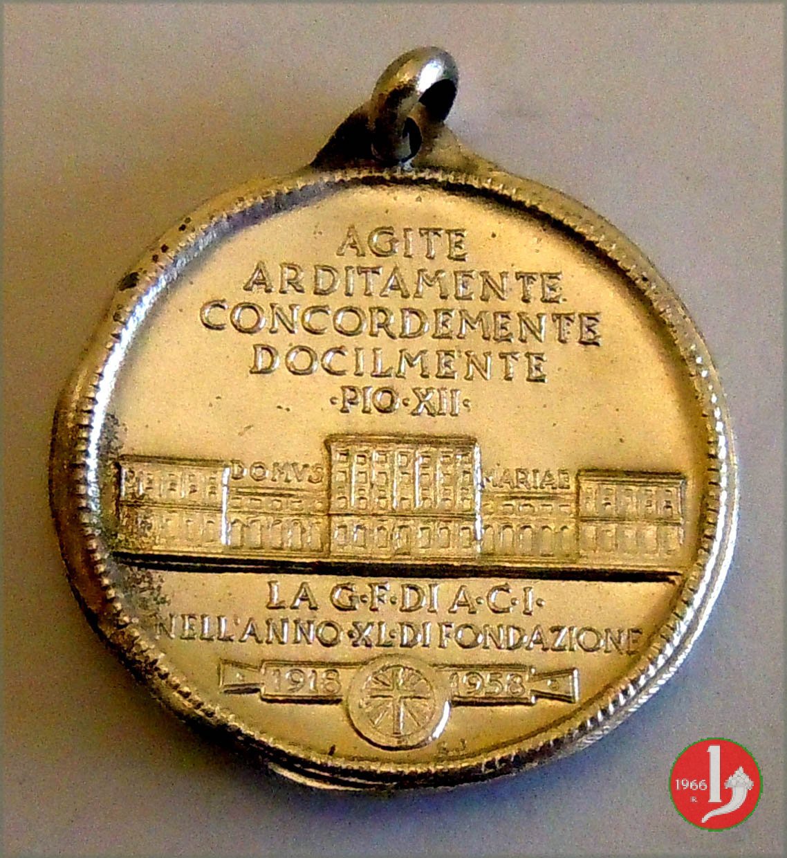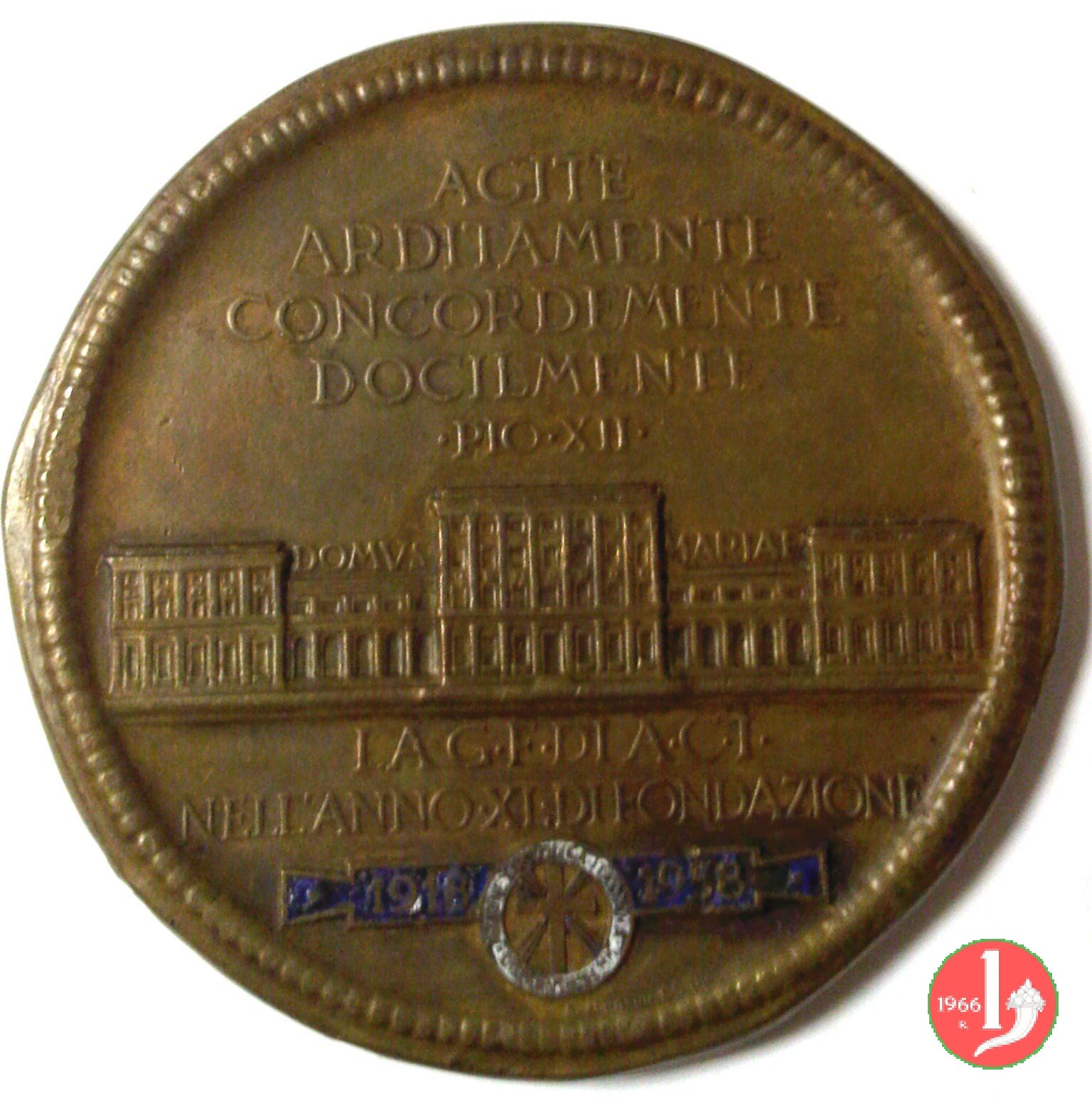 40° Giov. Femminile Az. Cattolica Italiana Dritto: la B.V. in piedi, a braccia aperte, su globo, coronata da stelle ai lati: MATER = MEA _ FIDVCIA = MEA sotto: G.C. Prospetto anteriore dell'edificio della DOMVS _ MARIAE di Roma in esergo: LA G • F • DI A • C • I • = NELL'ANNO • XL • DI FONDAZIONE = in cartella con al centro logo della Gioventú di Azione Cattolica Italiana 1918 _ 1958 | |