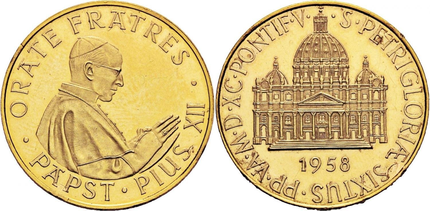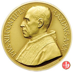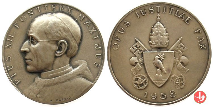 Stemma Papale Dritto: PIVS XII. PONTIFEX MAXIMVS busto a sx con berretto e cappa d'ermellino in basso sul busto: A. HARTIG Stemma Papale su chiavi coronato da triregno in basso: 1958 | |