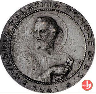 Guardia Palatina d'Onore 1941 -CM23 Dritto: PIVS XII PONT • MAX • busto a dx con berretto, mozzetta e stola in basso a dx: S.J. entro cerchio perlinato: busto di S. Pietro nimbato con camice, volto di 3/4 a sx, regge chiave a dx, presso la spalla: S.J. | |