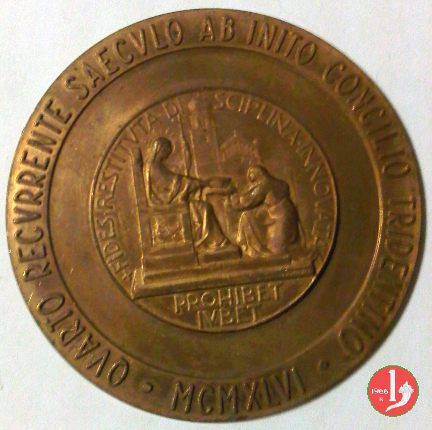 400° Concilio di Trento Prova Dritto: QVARTO RECVRRENTE SAECVLO AB INITO CONCILIO TRIDENTINO entro doppio cerchio con interposto piatto: + FIDES RESTITVTA DI _ SCIPLINA INNOVATA La Religione a sx seduta in trono riceve da figura genuflessa ai suoi piedi i volumi con gli atti del Concilio, sullo sfondo il Duomo di Trento, sulla base a dx: MISTRUZZI in esergo: PROHIBET = IVBET | |
