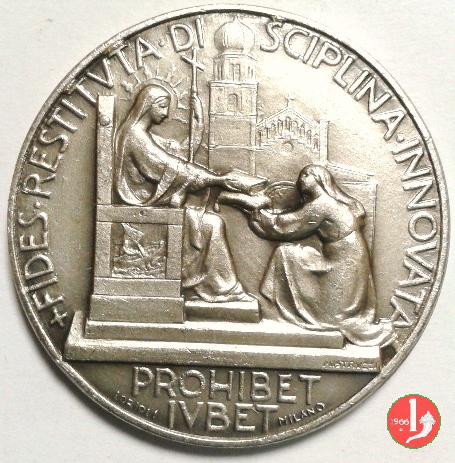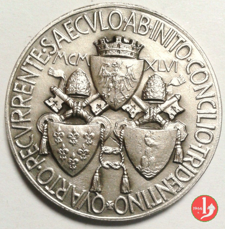 400° Concilio di Trento -CM51 Dritto: + FIDES RESTITVTA DI _ SCIPLINA INNOVATA La Religione a sx seduta in trono riceve da figura genuflessa ai suoi piedi i volumi con gli atti del Concilio, sullo sfondo il Duomo di Trento; sulla base, a dx: MISTRUZZI in esergo: PROHIBET = IVBET in basso, ai lati: LORIOLI _ MILANO in alto lo stemma coronato della Città di Trento, ai lati: MCM _ XLVI sotto: stemmi sormontati da triregni e chiavi decussate di Paolo III e Pio XII | |