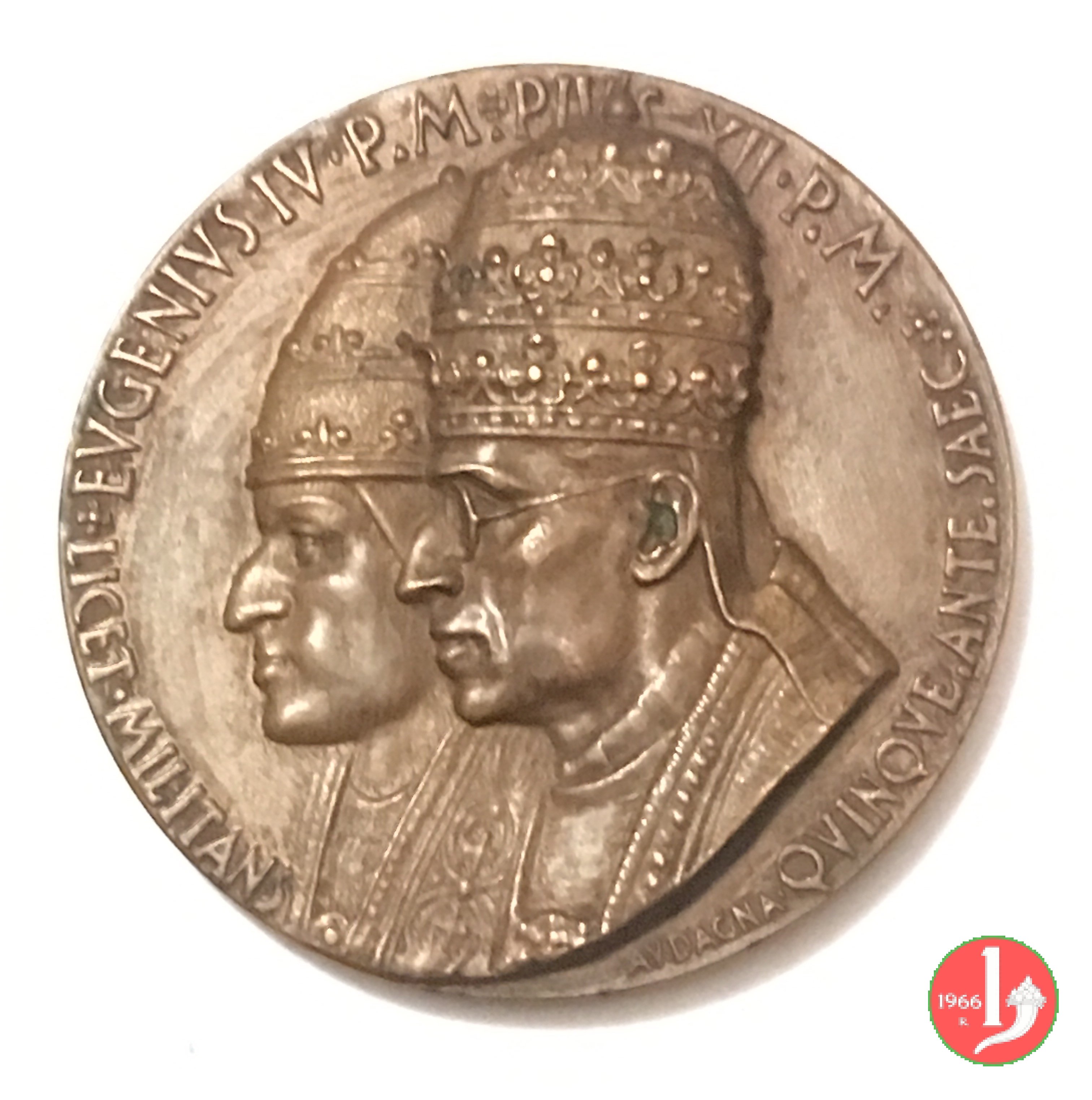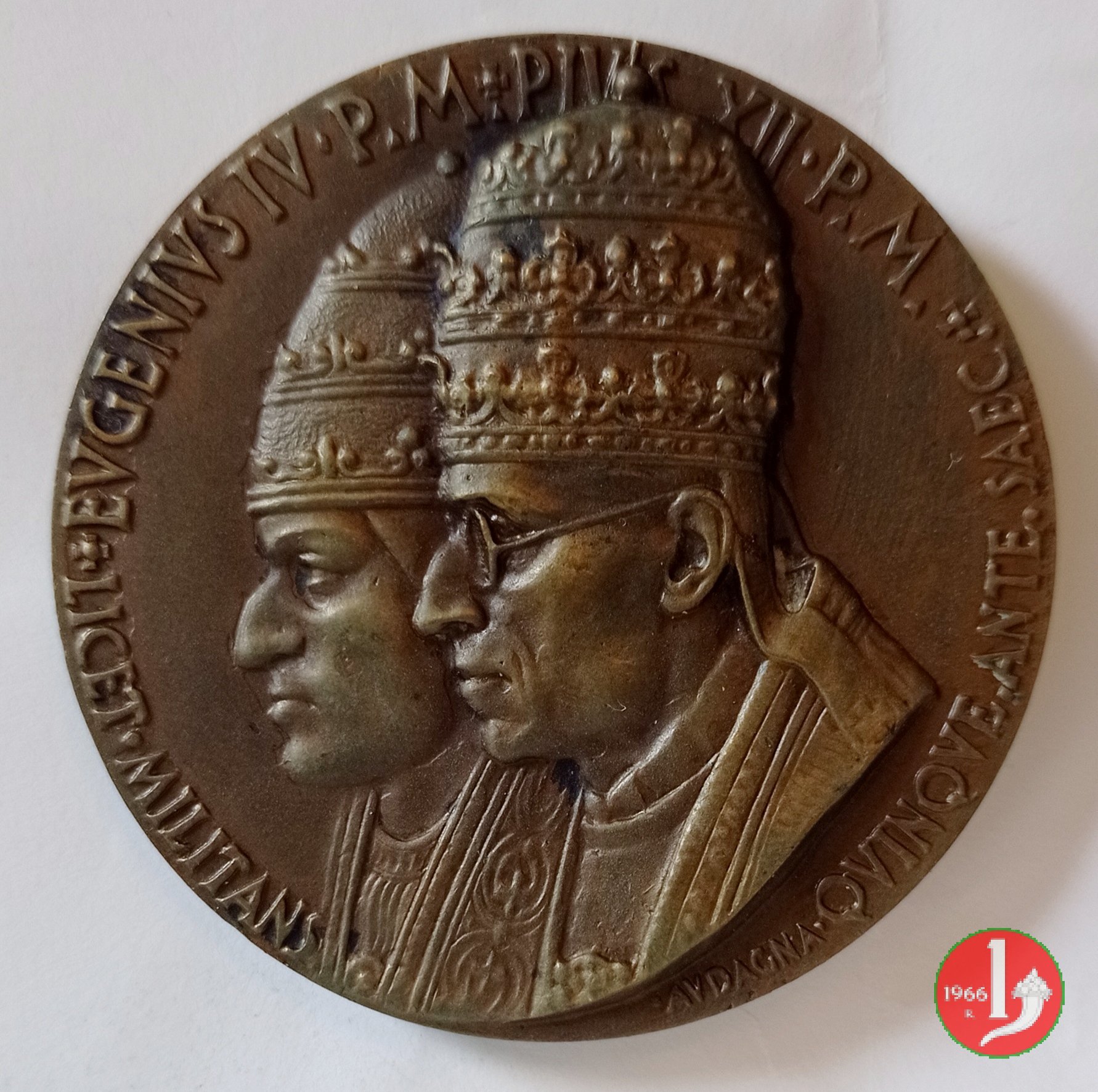 Obverse: EVGENIVS IV • P. M. PIVS XII • P. M. LICET • MILITANS QVINQVE ANTE. SAEC.