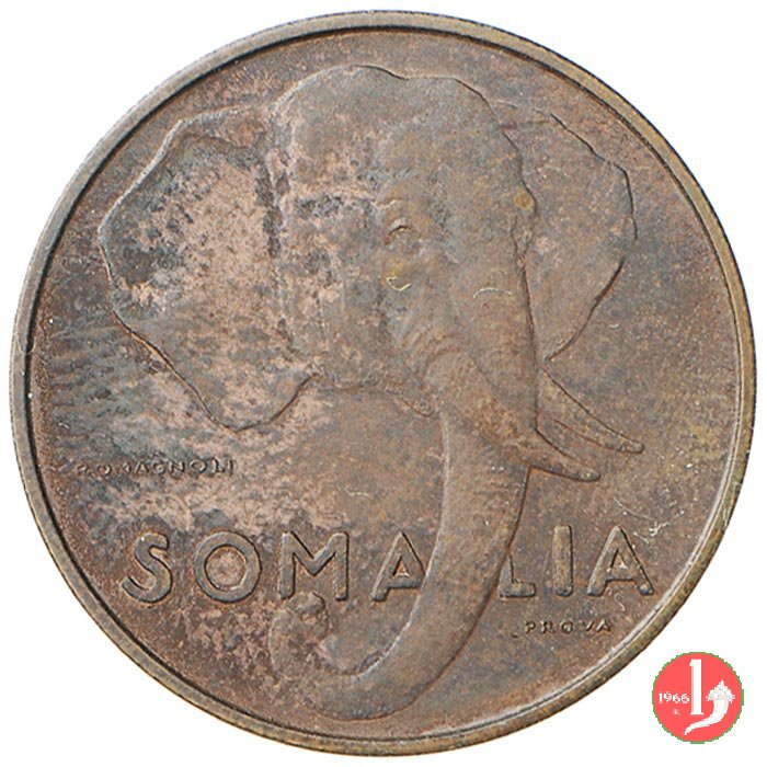 10 centesimo 1950 Dritto: Testa di elefante con, sotto la proboscide, la scritta SOMALIA e sotto a destra la scritta PROVA. Nel campo a sinistra la firma dell'incisore ROMAGNOLI. Verso: Nel campo, all'interno di un cerchio, l'indicazione del valore (10 CENTESIMI) su due righe. Intorno, nella parte inferiore le indicazioni in arabo, nella parte superiore la scritta ROMA 1950 e una stella a cinque punte tra mezzelune. | |