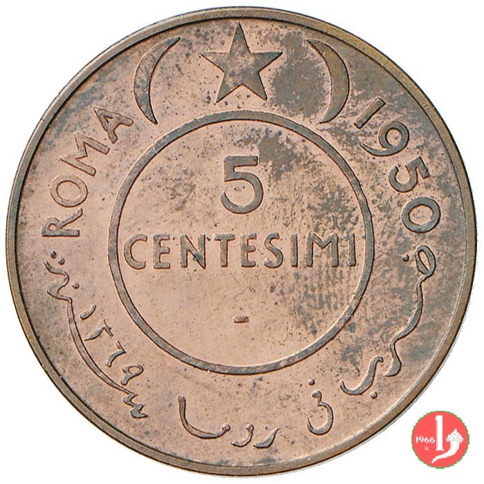 5 centesimi 1950 Dritto: Testa di elefante con, sotto la proboscide, la scritta SOMALIA e sotto a destra la scritta PROVA. Nel campo a sinistra la firma dell'incisore ROMAGNOLI. Verso: Nel campo, all'interno di un cerchio, l'indicazione del valore (5 CENTESIMI) su due righe. Intorno, nella parte inferiore le indicazioni in arabo, nella parte superiore la scritta ROMA 1950 e una stella a cinque punte tra mezzelune. | |