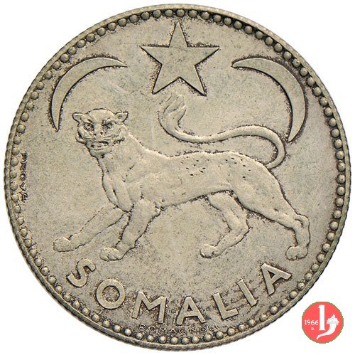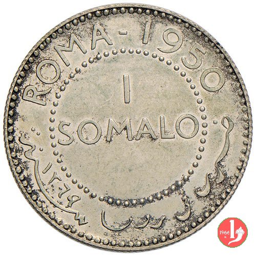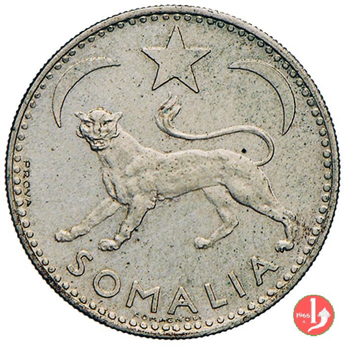 1 somalo 1950 Dritto: Leopardo sormontato da stella a 5 punte e due mezzelune. Sotto la scritta SOMALIA. A sinistra, vicino al bordo, circolarmente PROVA. Verso: Nel campo, all'interno di un cerchio, l'indicazione del valore (1 SOMALO) su due righe. Intorno, nella parte inferiore le indicazioni in arabo, nella parte superiore la scritta ROMA 1950. | |