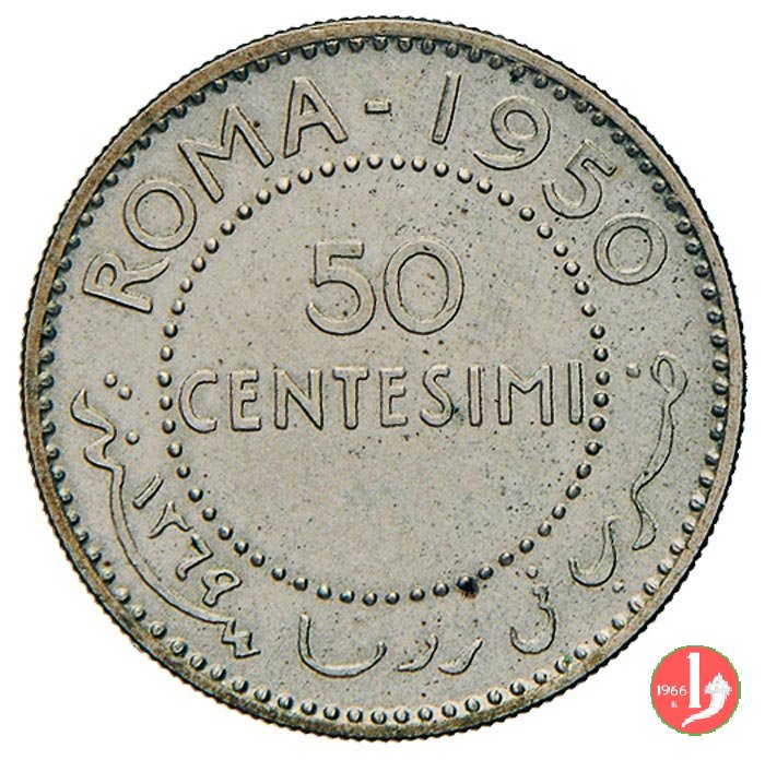 50 centesimi 1950 Dritto: Leopardo sormontato da stella a 5 punte e due mezzelune. Sotto la scritta SOMALIA. A sinistra, vicino al bordo, circolarmente PROVA. Verso: Nel campo, all'interno di un cerchio, l'indicazione del valore (50 CENTESIMI) su due righe. Intorno, nella parte inferiore le indicazioni in arabo, nella parte superiore la scritta ROMA - 1950. | |