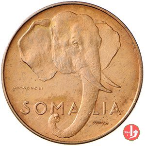 1 centesimo 1950 Dritto: Testa di elefante con, sotto la proboscide, la scritta SOMALIA e sotto a destra la scritta PROVA. Nel campo a sinistra la firma dell'incisore ROMAGNOLI. Verso: Nel campo, all'interno di un cerchio, l'indicazione del valore (1 CENTESIM0) su due righe. Intorno, nella parte inferiore le indicazioni in arabo, nella parte superiore la scritta ROMA 1950 e una stella a cinque punte tra mezzelune. | |