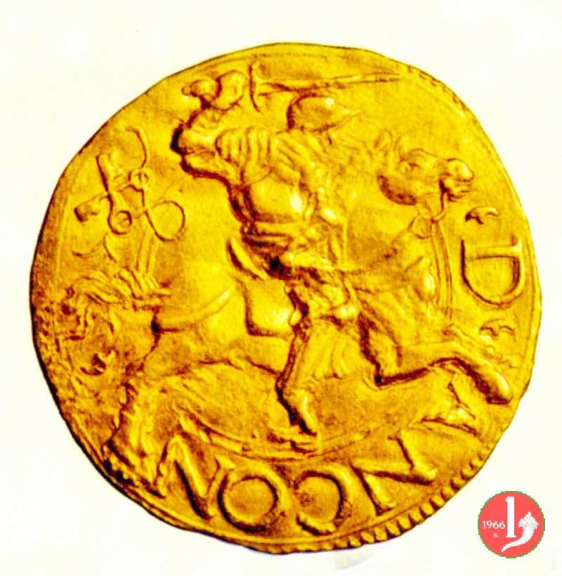 Grosso (II t.) Dritto: ![]() ANCON • D •CIVI__TAS •FI • /Cavaliere galoppante a sinistra con spada branditaVerso: S •KIRIA__CVS •EPS • /S.Ciriaco, in piedi di fronte, nimbato e mitrato, benedicente e con lunga croce tenuta obliquamente | |