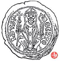 Denaro con aquila Dritto: BЄRTOLDVS P, il patriarca, seduto in faldistorio, con mitria e pianeta ornata da globetti. Regge con la mano destra croce e con la sinistra libro. Doppio contorno perlinato. Verso: + CIVITAS (globetto) AQVILЄGIA Aquila ad ali aperte rivolta a sinistra sopra un edificio, con ingresso ad arco. Contorno perlinato. | |
