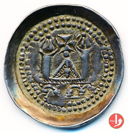 Denaro anonimo Dritto: + A(QUI)LE - GIA (globetto) P (globetto), il Patriarca rappresentato frontalmente, seduto su faldistorio, regge pastorale con la mano destra, nella sinistra libro. Verso: Tempio sostenuto da 5 colonne e 4 archi, con frontone triangolare (al di sopra globetto) e due torri terminanti con cupole e globetto. Tra le torri croce. |