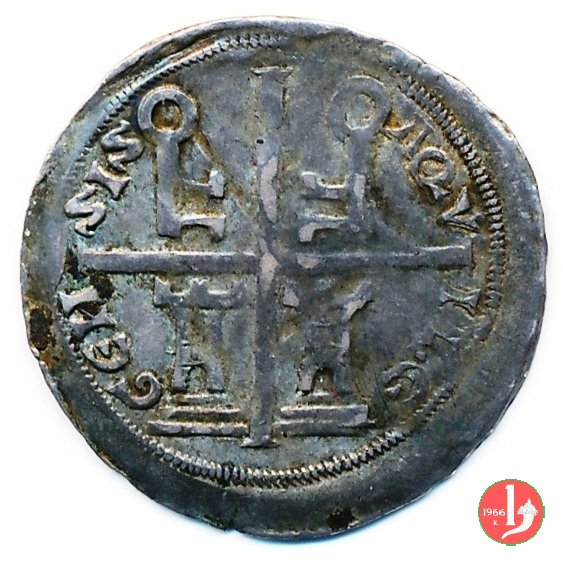 Denaro con chiavi e torri Dritto: RAIMV-NDV' PA, il Patriarca seduto di fronte con croce patriarcale nella mano destra e libro nella sinistra Verso: AQV-ILE-GEN-SIS, croce patente accantonata da due chiavi e due torri | |