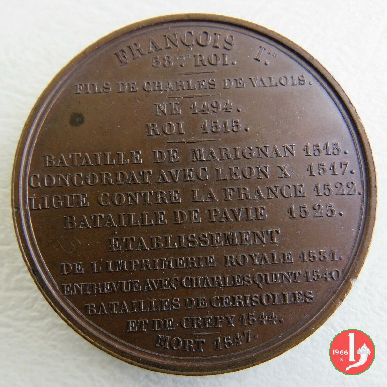 nel campo: 58.eme ROI. = - = FIL DE CHARLES DE VALOIS. = - = NE 1494 = - = ROI 1515. = - = BATTAILLE DE MARIGNAN 1515. = CONCORDAT AVEC LEON X 1517. = LINGUE CONTRE LA FRANCE 1522. = BATTAILLE DE PAVIE 1525. = ETABLISSEMENT = DE L'IMPRIMERIE ROYALE 1531. = ENTREVUE AVEC CHARLES QUINT 1540 = BATAILLES DE CERISOLLES = ET DE CREPY 1544. = - = MORT 1547.