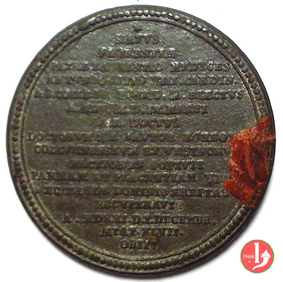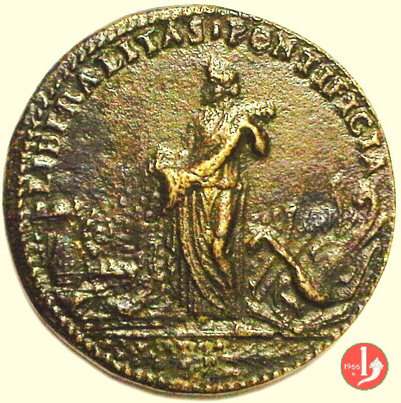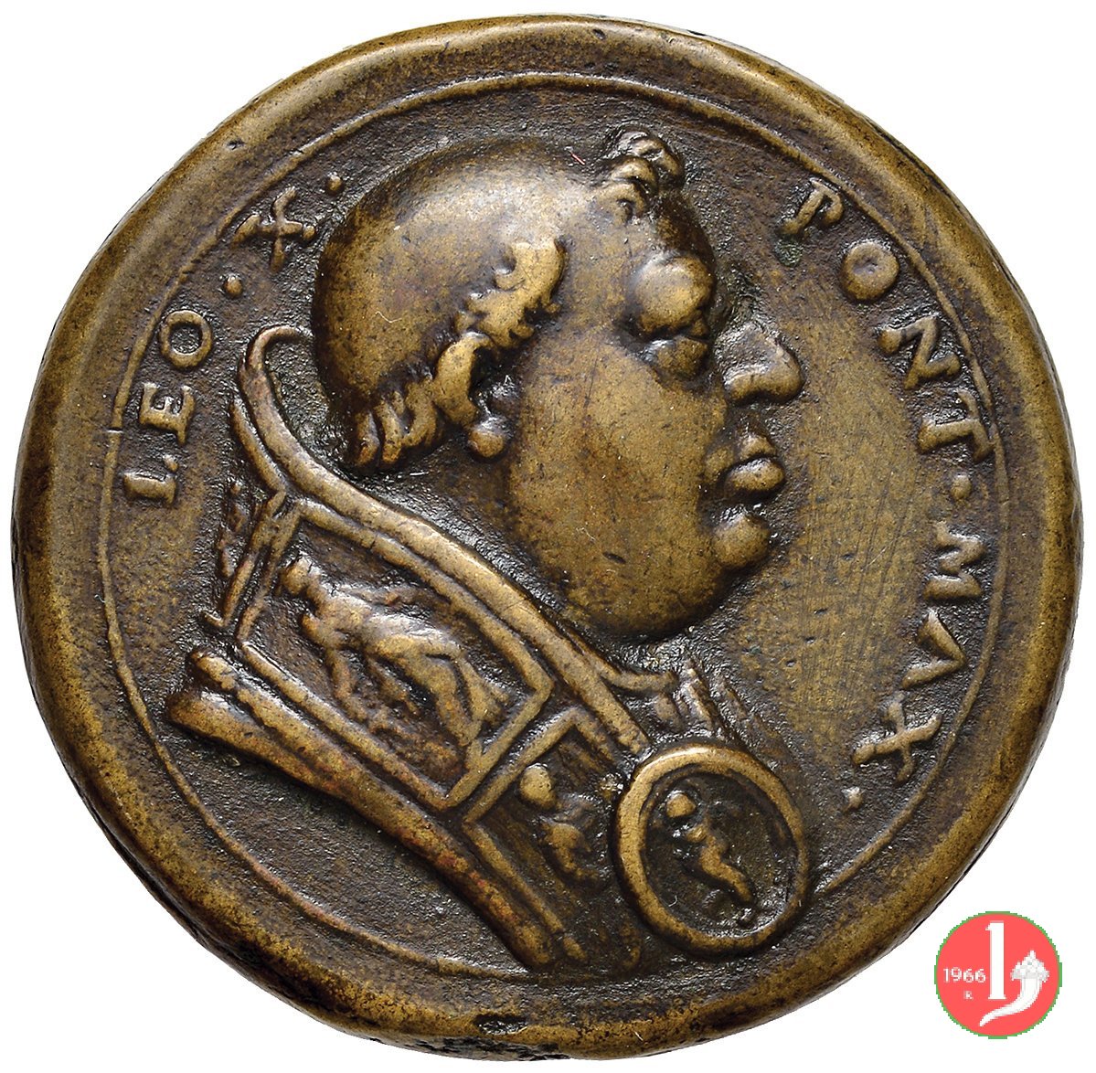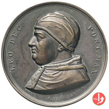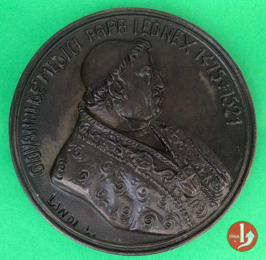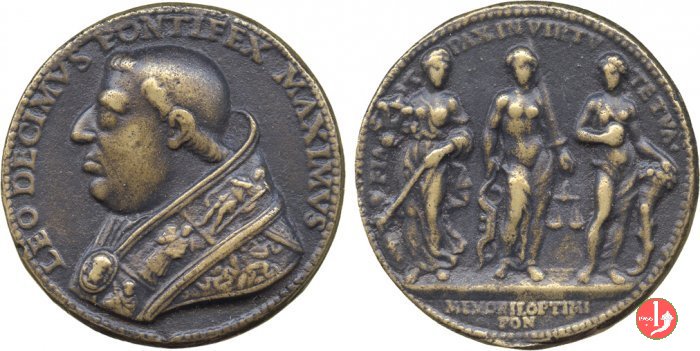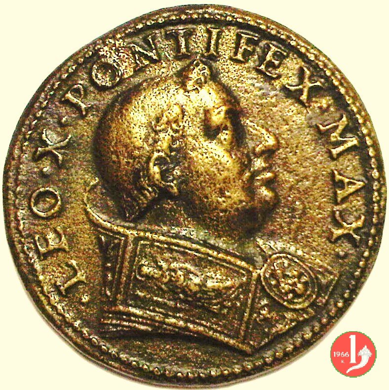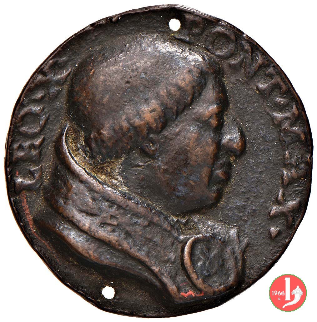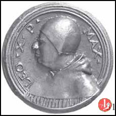 Verso: nel campo: * = NATUS = FLORENTIAE = PATRE LAVRENTIO MEDICES = AB INNOCENTIO VIII • CARDIN • = A • S • COLLEGIO PONTIF • M • ELECTVS = A • MDXIII • D • IX • MARTI = VIR DOCTVS = DOCTORVMQVE FAVTOR EGREGIVS = COLLVMNENSIVM ET VRSINORVM = FACTONES SOPIVIT = PARMAM ET PLACENTIAM VRBES = ECCLESIAE DOMINIO EREPTAS = RECVPERAVIT = A • MDXXI • D • I • DECEMBR • = AETAT • XLVI • = OBIIT