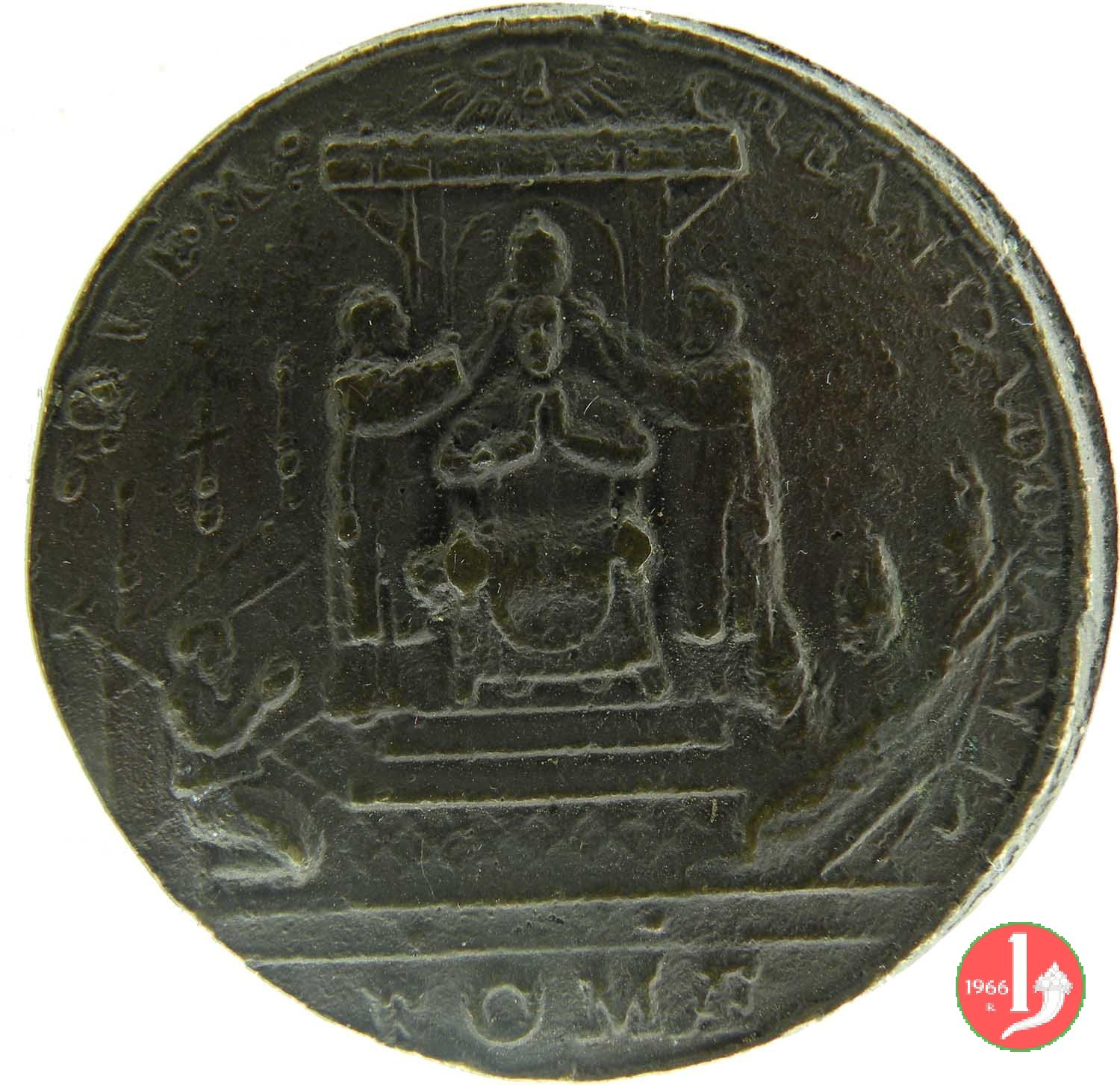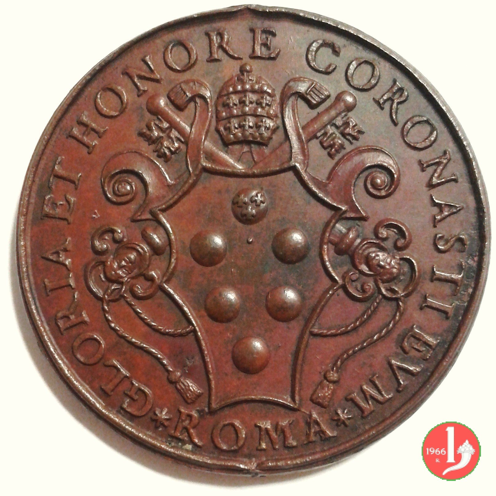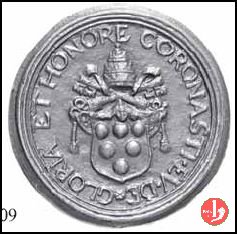 Verso: Stemma papale, tra due volute, su chiavi decussate, coronato da triregno