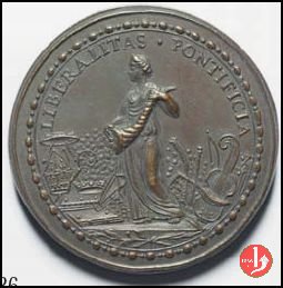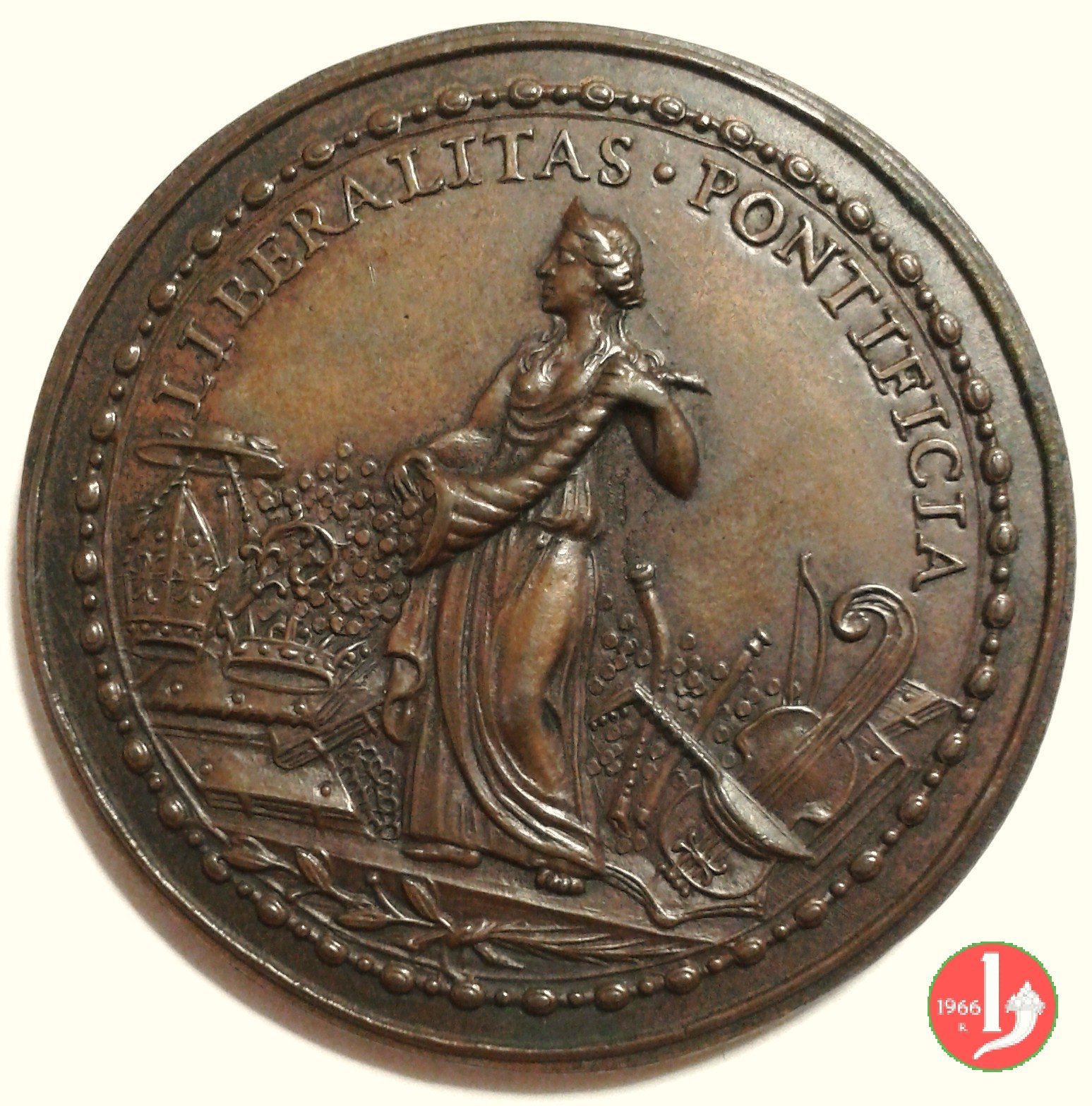 Figura allegorica della Liberalità, in piedi, volta a sx, regge cornucopia, seminando monete su simboli ecclesiastici e strumenti musicali
