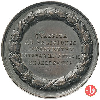 Verso: entro corona mista di quercia e alloro: QVAESITA = AD RELIGIONIS = INCREMENTIVM = LITERAR ET ARTIVM = EXCELLENTIA