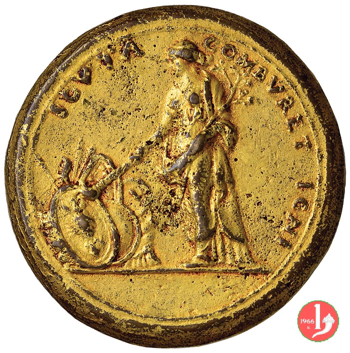 La figura allegorica della Pace, in piedi, volta a sx, regge ramo d'ulivo e dà fuoco, con torcia, a cumulo d'armamenti