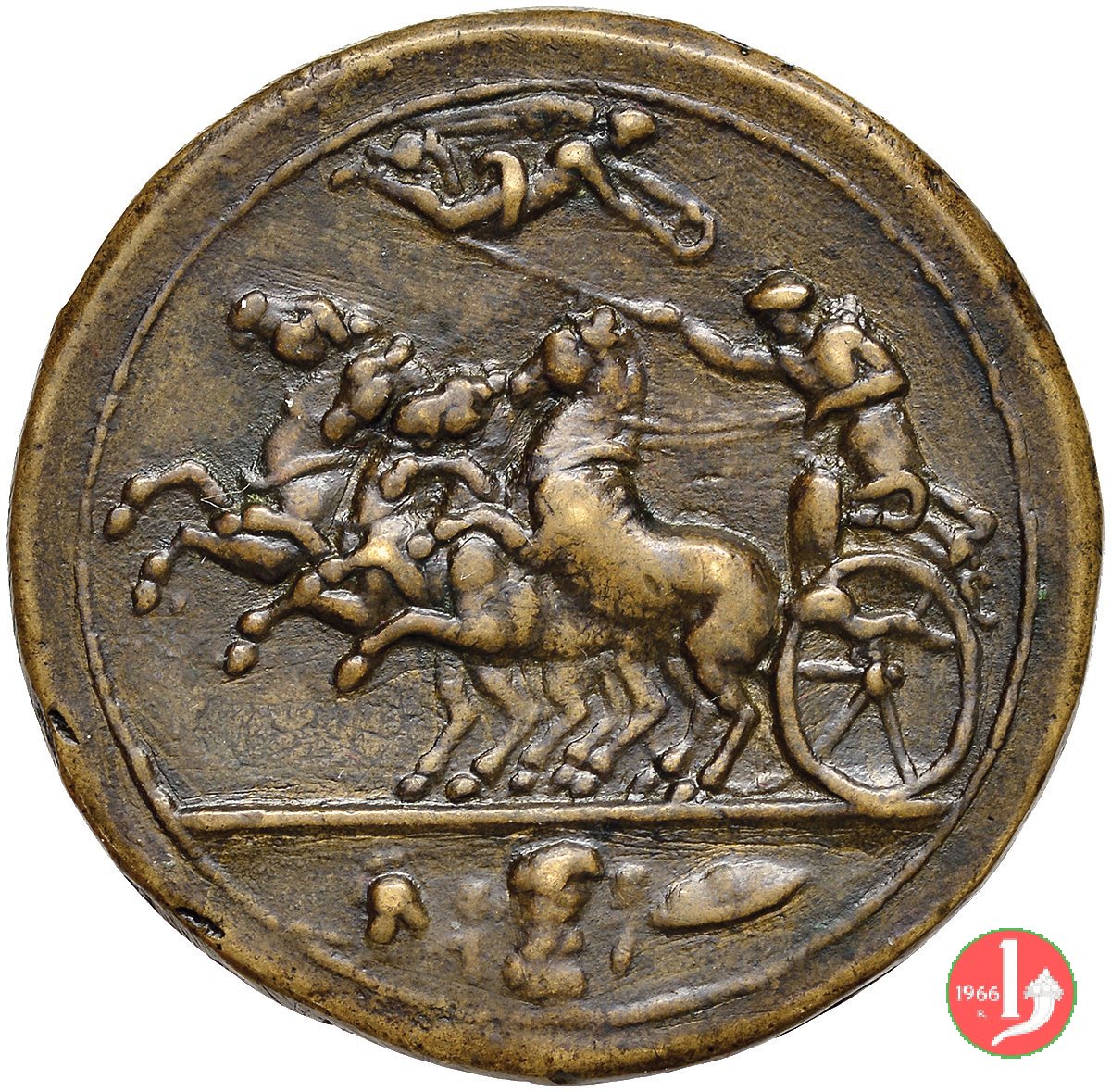 Verso: Quadriga al galoppo verso sx e vittoria in volo verso dx che incorona l'auriga (tratta dal decagramma di Siracusa)