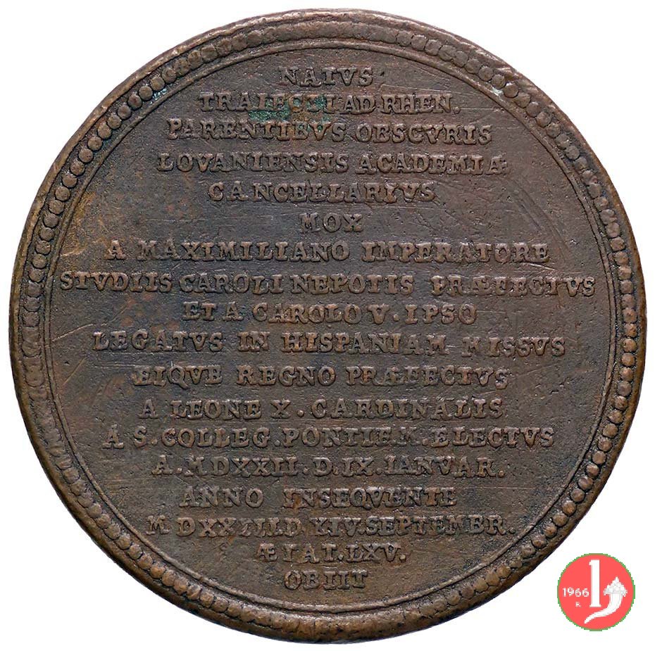 Verso: nel campo: NATVS = TRAIECTI AD RHEN • = PARENTIBVS OBSCVRIS = LOVANIENSIS ACADEMIA = CANCELLARIVS = MOX = A MAXIMILIANO IMPERATORE = STVDII CAROLI NEPOTIS PRAEFECTVS = ETA CAROLO V • IPSO = LEGATVS IN HISPANIAM MISSVS EIQVE REGNO PRAEFECTVS A LEONE X • CARDINALIS A S • COLLEGI • PONTIF • M • ELECTVS • A • MDXXII • D • IX • IANVAR • ANNO INSEQVENTE MDXXIII • D • XIV • SEPTEMBR • AETAT • LXV • OBIIT
