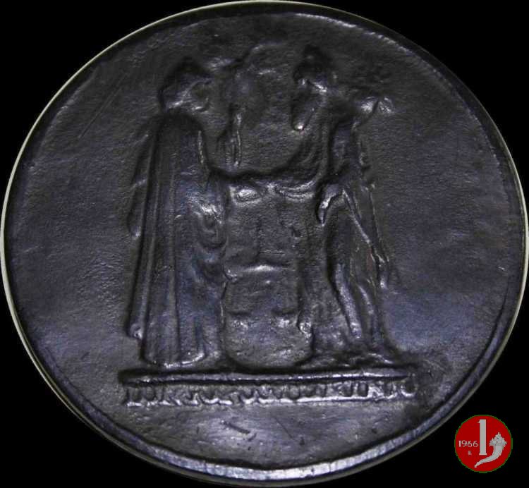 Verso: Figure allegoriche della Pace e della Abbondanza che si stringono la mano; tra loro la bilancia è emblema della Giustizia