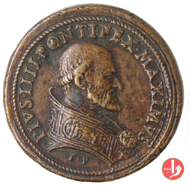 Morte di Pio IV -Mo568 Dritto: PIVS • IIII • PONTIFEX • MAXIMVS busto a sx con piviale Angelo in volo verso dx, cinge con serto d'alloro il capo di un toro, volto a dx | |