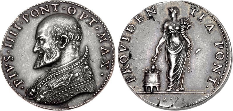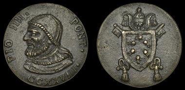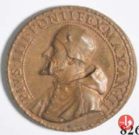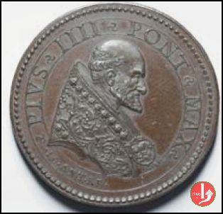 En Hvivs Laeta Avspitiis -Mo505 Dritto: • PIVS • IIII • PONT • _ • MAX • AN • I • busto a sx con camauro e mozzetta la figura allegorica di Roma, elmata, seduta verso dx, su cumulo d'ami, regge vittoria alata che protende serto d'alloro; sullo sfondo, a sx: figura sotto ad albero | |