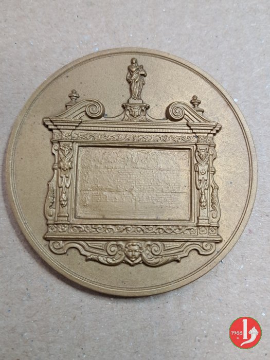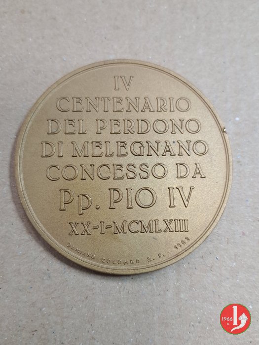 400° Perdono di Melegnano 1963 Dritto: entro ampia cornice rettangolare ornata da volute tra teste di Cherubini e sormontata dall'immagine della B. V. Maria orante in piedi: la Bolla del Perdono di Melegnano Verso: nel campo: IV = CENTENARIO = DEL PERDONO = DI MELEGNANO = CONCESSO DA = PP. PIO IV = XX-I- MCMLXIII in basso circolarmente: DAMIANO COLOMBO & F. 1963 |
