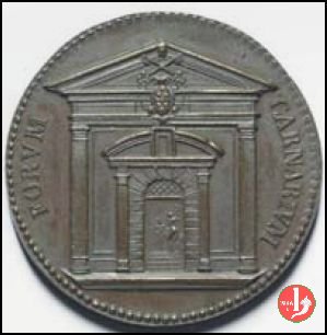 Ingresso mercato della carne Bologna -Mo563 Dritto: • PIVS • IIII • PONT • MAX • (punti trinacria) Busto a dx con piviale sotto: • IO • ANT • R • F • Prospetto anteriore del nuovo ingresso al mercato | |