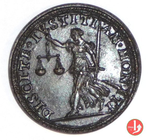 La Giustizia -Mo574 Dritto: PIVS • IIII • PONTIFEX • MAXIMVS busto a sx con piviale la figura allegorica della Giustizia, con abito drappeggiato e gradiente a sx, regge bilancia e spada | |