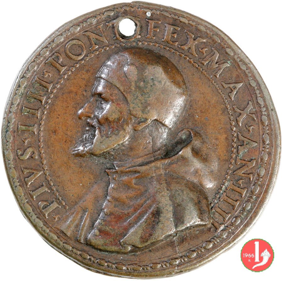 Sicurezza del popolo Romano -Mo517 Dritto: • PIVS • IIII • PONT • MAX • O • P • busto a dx con piviale decorato con scena dell'udienza papale figura seduta verso destra con asta presso un'ara | |